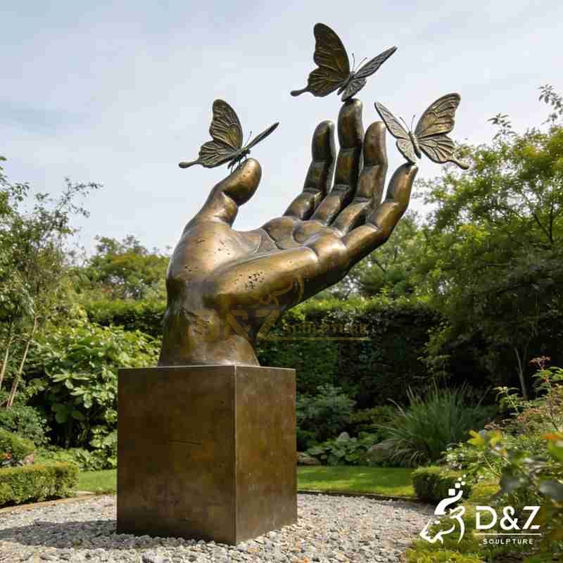 D&Z Art Sculpture's large bronze hand-holding sculpture with butterflies uses the handle as the main visual element. The hand points upward, with fingers naturally spread, conveying a sense of support and acceptance. Several butterflies rest on the fingertips, their details clearly defined. The bronze hand sculpture seems to depict the butterflies about to take flight, evoking the contact and interaction between life forms.