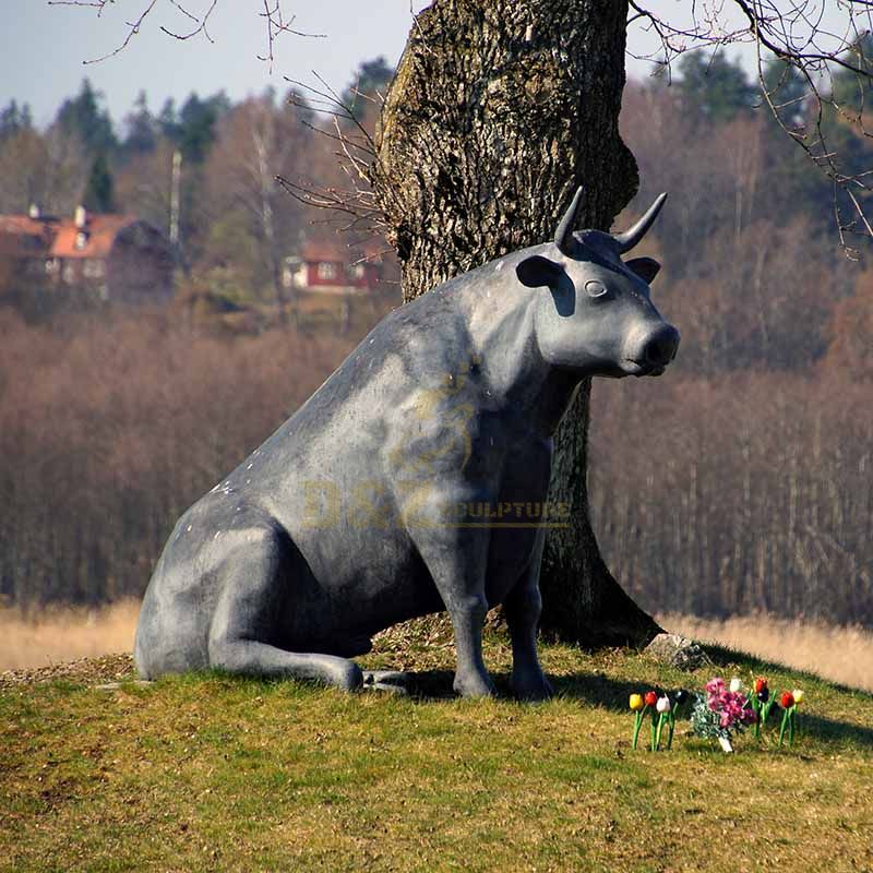 This is a sitting bronze bull sculpture. The cow symbolizes wealth and strength in Western culture, and it also symbolizes hard work in China. The bronze bull sculpture is deeply loved by people. This bronze bull sculpture was cast by a master with exquisite craftsmanship. The master knows the details of the bronze bull sculpture very well and has carved every detail of the bull sculpture to life.