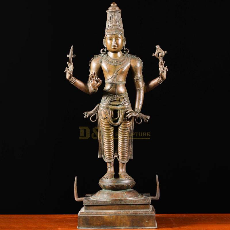 This is a life-size metal-cast bronze lord Vishnu statue. Vishnu is the highest god of Hinduism. Vishnu is also called Narayana and Hari. He is revered as the supreme being in the Vishnu sect and as the supreme in ancient sacred texts like Bhagavad Gita.