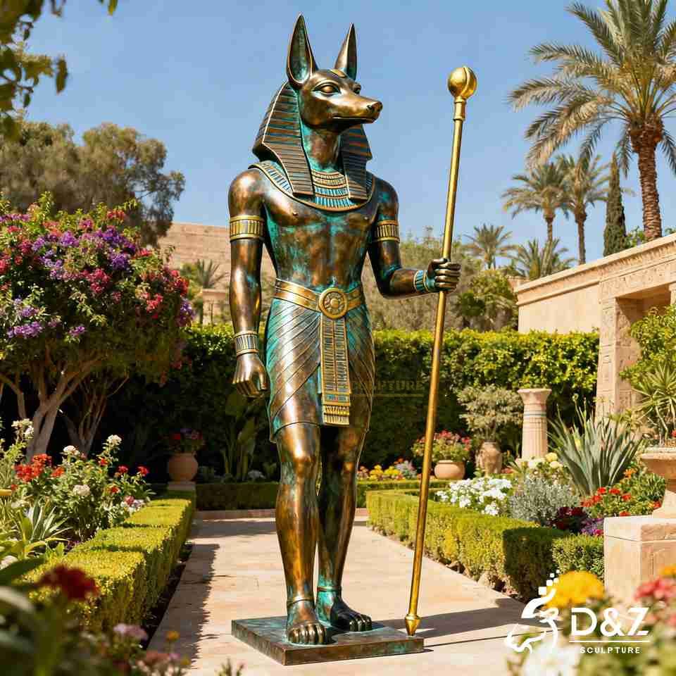 D&Z Art Sculpture's large bronze Anubis God Statue is inspired by ancient Egyptian legend, featuring a classic silhouette combining a jackal head with a human body. The large Anubis statue stands tall, adorned with a headdress symbolizing divinity and traditional Egyptian attire, featuring intricate and vivid carvings. The scepter in its right hand symbolizes protection and strength. Cast entirely in bronze and treated with a special process, the surface acquires a patina of age and a metallic sheen, imbuing the piece with a blend of rusticity and mystery, creating a solemn and artistic atmosphere.