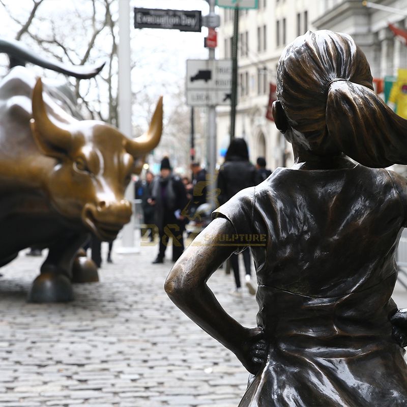 The statue shows a girl four feet high and represents female empowerment. The bronze ponytailed girl standing with hands-on-hips was installed in March 2017 opposite the longstanding bull at the bottom end of Broadway in Manhattan. The pair’s juxtaposition became a selfie hit and a new symbol of the gender-equality movement. If you need the wall street bull fearless girl statue replica, please consult us.