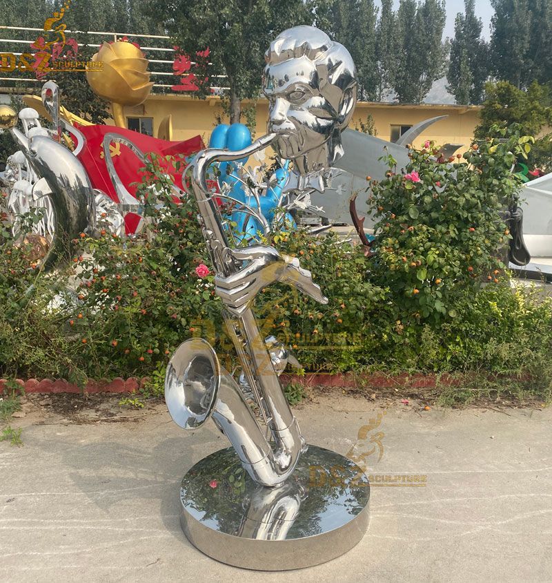 Here in this picture, we can compare the different effect of mirror finishing and the gold plated effect. finally which effect of metal saxophone player statue you like ?