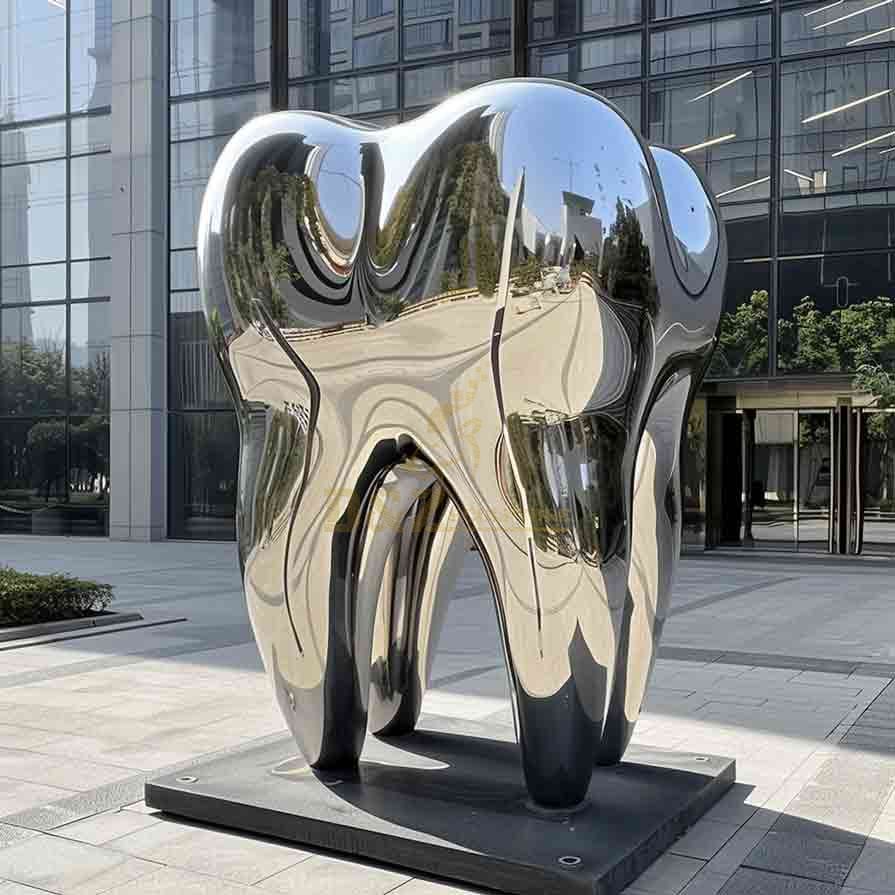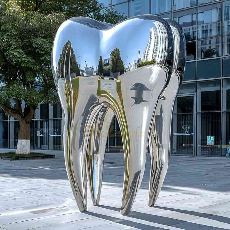 Our mirrored stainless steel Giant Tooth Sculpture has a unique shape, exquisite craftsmanship, and profound themes, perfectly integrating art and health concepts, making sculptures not only decorations but also an important medium for conveying oral health!
