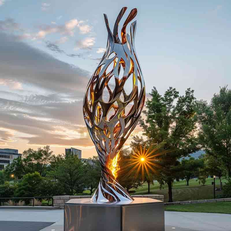 Our large hollow abstract flame sculptures, with their mirrored stainless steel material, present an elegant and delicate luster. Under the sunlight or light, the surface of the sculpture reflects thousands of lights, as if the flames are jumping on it, burning hope and dreams. This unique visual effect not only makes people's eyes shine but also inspires resonance and reverie in the heart of the viewer.