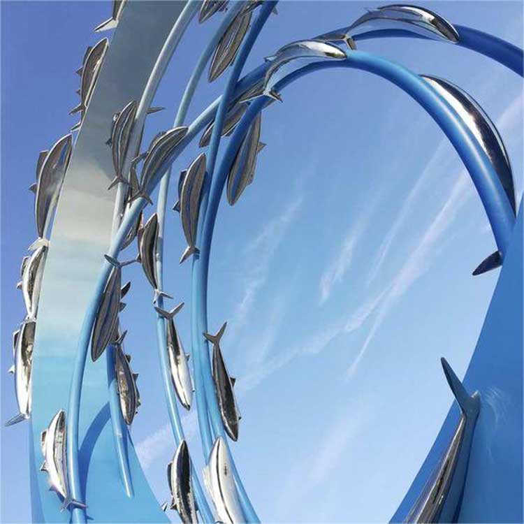 The main body of the sculpture is made of high-quality stainless steel, which is strong and durable. Each ring is finely polished electroplated and painted to ensure it displays a gorgeous and long-lasting luster. The color of the ring is mainly sea blue, and the top is composed of gradient white, which seems to be a perfect blend of ocean and sky.