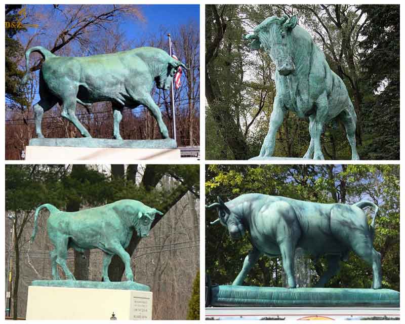 This famous Smithtown bull statue was installed Long Island town of Smithtown, the original bull statue standing on a very tall and large concrete base, it is very outcoming with bronze-green patina, why named Whisper, In an English competition, the last primary school student chose this name for this bronze bull statue. After a long time of outdoor rain and sun, the color turned green, it is very normal for cast bronze statues, all statues will become green, more long time more green, but it is ok, this color very natural popular and Luxurious, contact D&Z art sculpture get the good way to maintain the bronze bull statue surface.