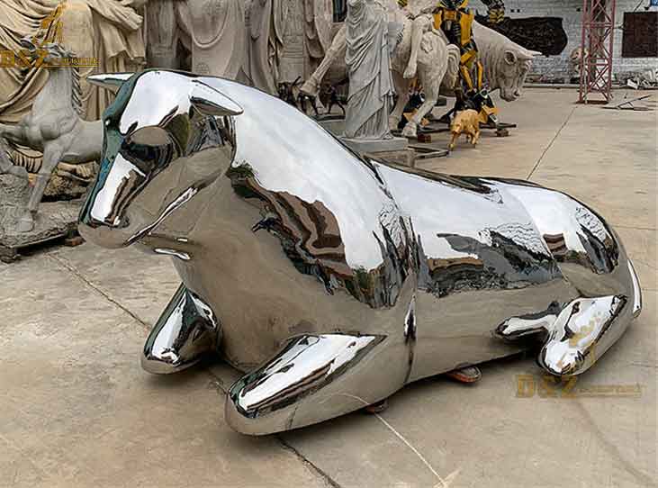 This is a sitting bull statue made with stainless steel mirror finished, we call this bull is stainless steel bull statue, shiny and also modern effect.
