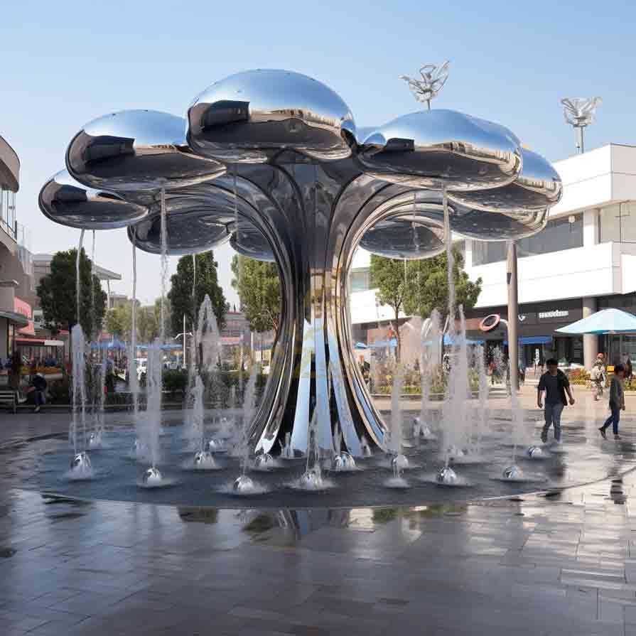 D&Z Art Sculpture launches an outdoor giant mushroom water fountain, inspired by the abstract mushroom cloud, which perfectly combines the beauty of nature with modern technology. The sculpture is made of 304 stainless steel, mirror polished, and the overall luster is bright, showing a sense of the future. The umbrella-shaped cloud design combines the smart waterscape and lighting effects to bring a fantastic visual and auditory feast that makes people linger.