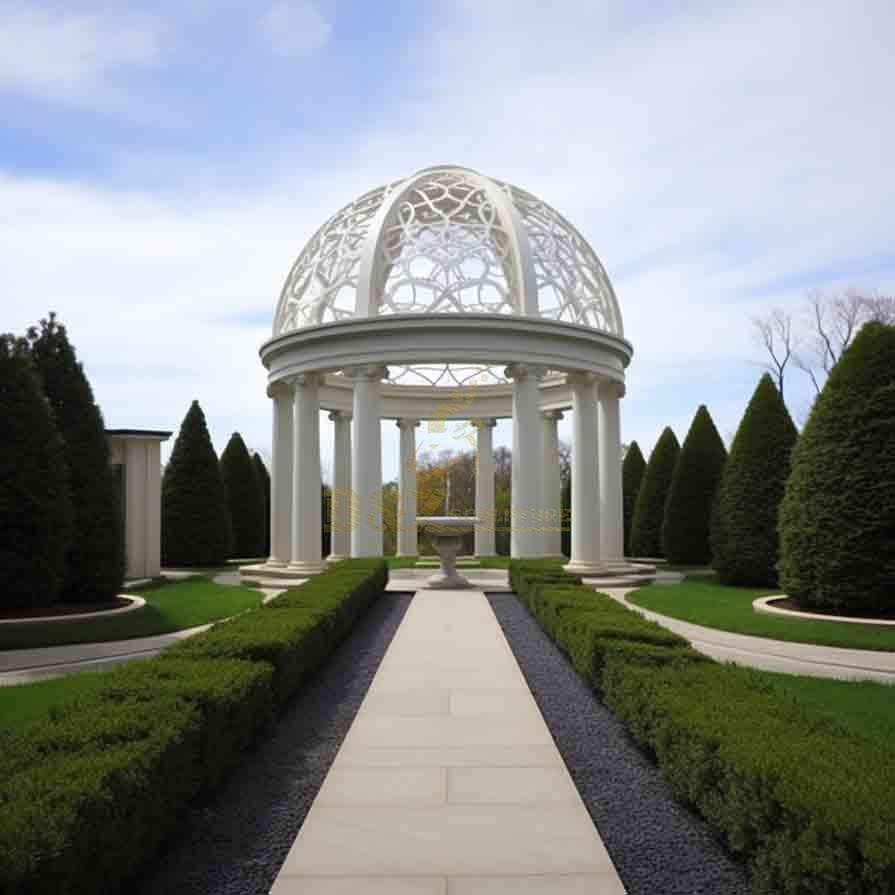 In the embrace of nature, looking for a quiet and elegant place, D&Z Art Sculpture launches an exquisite white marble gazebo with a round design, combined with a marble or metal glass ceiling, which perfectly blends classic and modern beauty. The marble frame shows classic stability and solidity, while the metal glass ceiling brings a modern sense of transparency, becoming an artistic focus in places such as gardens, courtyards, or parks. Whether it is a marble metal gazebo or a marble glass gazebo, it can add an elegant atmosphere to your space and blend perfectly with the surrounding environment.