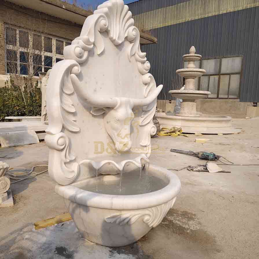 D&Z Art Sculpture launches a large marble wall fountain, made of Guangxi white marble, combined with exquisite hand-carving craftsmanship, showing a noble and elegant temperament. The back carving decoration of the fountain is mainly in classical style, and the exquisite patterns and curves enhance the overall elegance. The bull head statue highlights the symbol of strength and tenacity, and its lifelike carving shows exquisite craftsmanship.