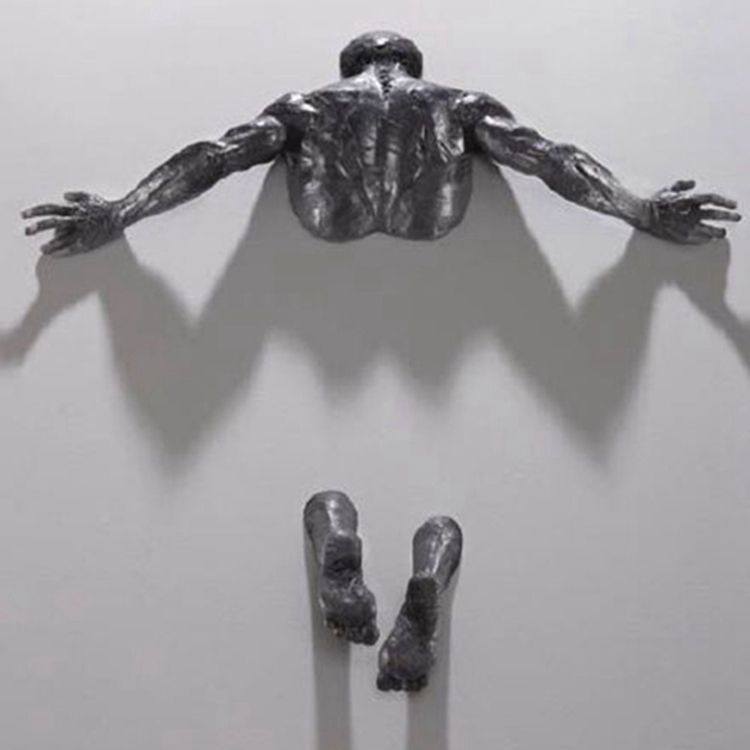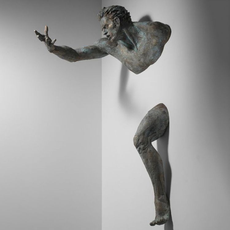 The wall mounted figure sculptures are designed by Matteo Pugliese, a famous Italian sculptor. These sculptures are made up of several parts. They are like a person who is embedded in the wall, and he is trying his best to get rid of the wall.